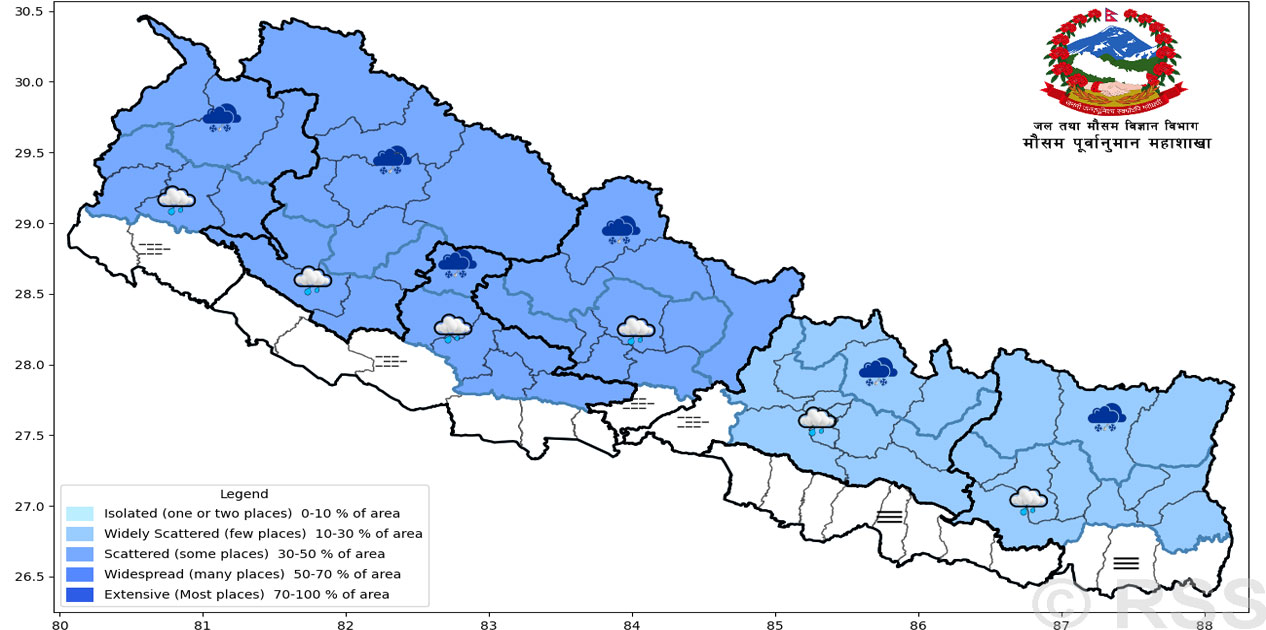 देशमा पश्चिमी वायुको आंशिक प्रभाव, केही स्थानमा हल्का वर्षा र हिमपातको सम्भावना