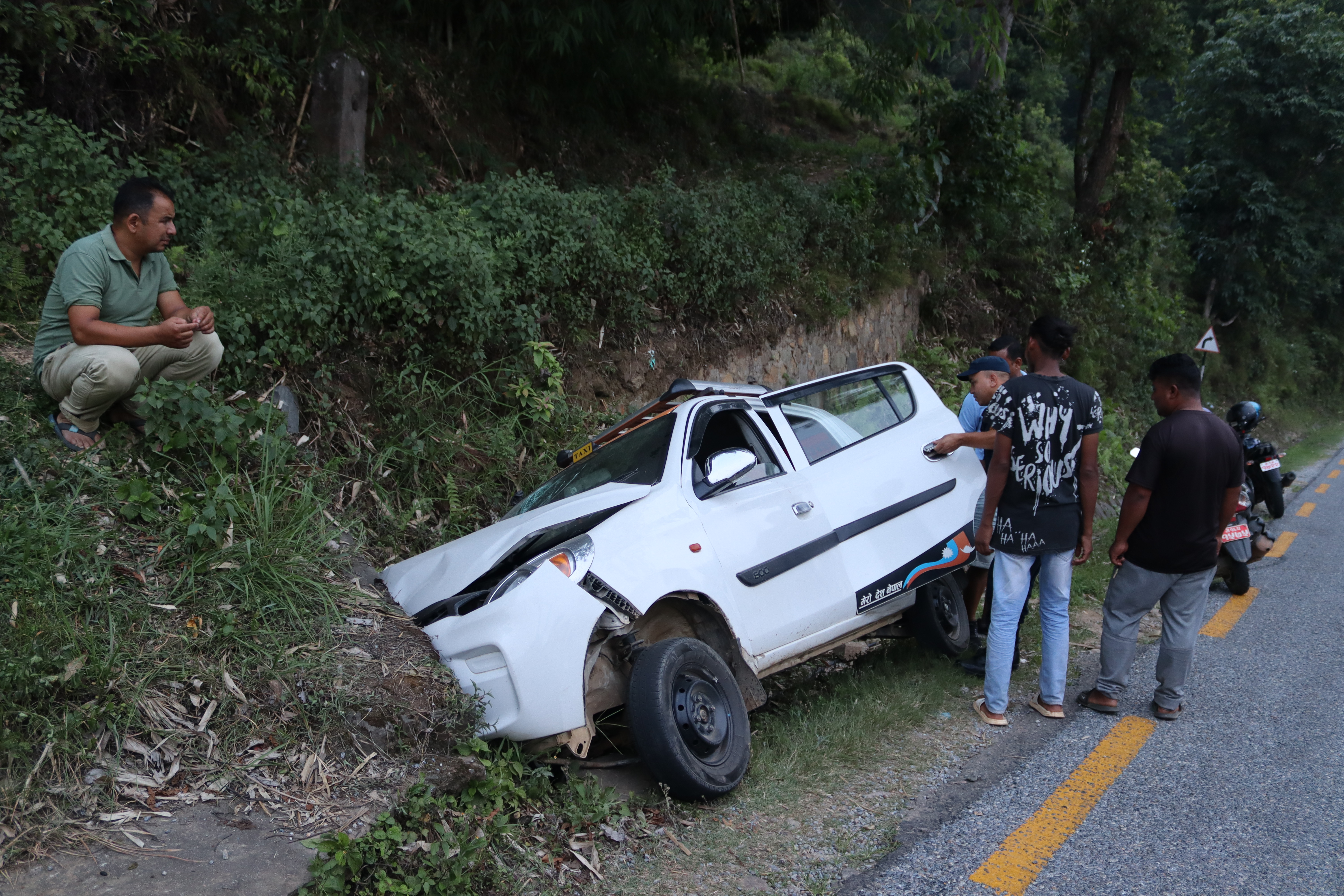 गोर्खा ।तनहुदेखि गोर्खा बजार जाँदै गरेको बा १ ज७९७६ नम्बरको ट्याक्सी सनिवार बेलुकि पख १३ किलोमा दुर्घटनामा परेकोछ।ट्याक्सी चालक भिमबहादुर बिश्वकर्मा घाइते भएकाछन।उनलाइ उपचारको लागि गोर्खा अस्पताल लगिएकोछ।उनको अवस्था भने सामान्य रहेको प्रहरीले जनाएकोछ।ढुङ्गा बोकेर गोर्खा जाँदै गरेको ट्याक्सी एक्कासि अनियंत्रित हुदा दुर्घटना हुन पुगेको हो।ट्याक्सीले ढुङ्गा मात्र बोकेको थियो।