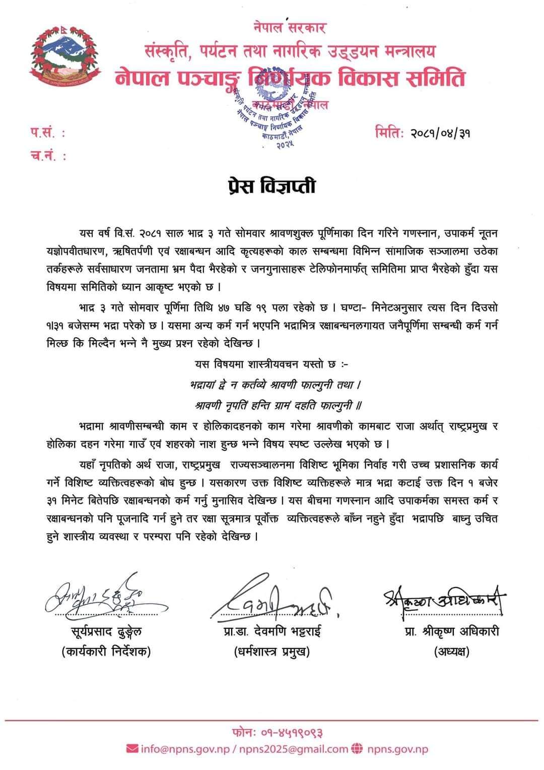 साउन २ काठमाडौ ।साउन ३ गते जनैपूणिर्मा ।जनै लाउने साइत १ बजेर ३१ मिनेट पछि।यस सम्बन्धमा पन्चाङ्ग निर्णायक समितीले पुनः स्पष्ट पार्दै जानकारी समेत गराएकोछ।