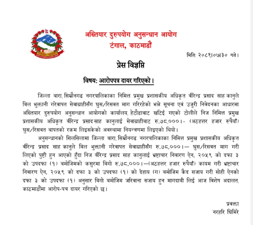 ३० कार्तिक काठमाडौ ।अख्तियार दुरुपयोग अनुसन्धान आयोगले सेवा ग्राहीबाट घुस लिएको आरोपमामा बारा सिम्रौनगढ नगरपालिकाका निमित्त प्रमुख प्रशासकिय अधिकृत बिरेन्द्र प्रसाद साह कानुलाइ नियन्त्रणमा लिएर आज काठमाडौ विशेष अदालतमा आरोपपत्र दायर गरेकोछ।