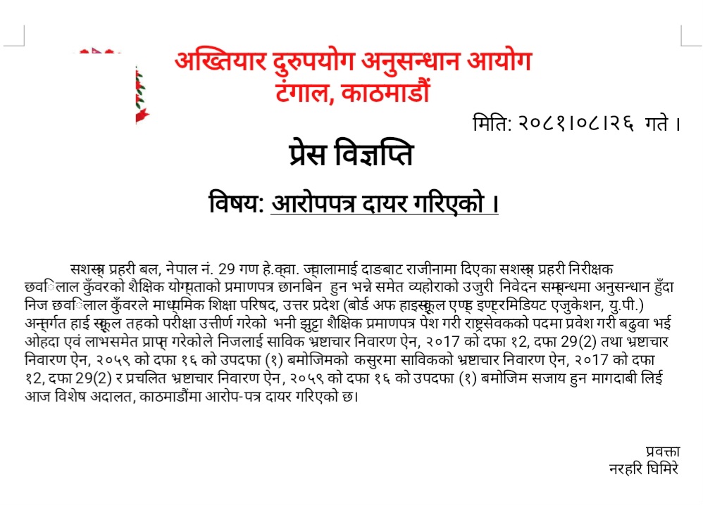 काठमाडौँ । अख्तियार दुरुपयोग अनुसन्धान आयोगले सशस्त्र प्रहरी बलका एक जना प्रहरी निरीक्षक (इन्सपेक्टर) विरुद्ध भ्रष्टाचार मुद्दा दायर गरेको छ ।