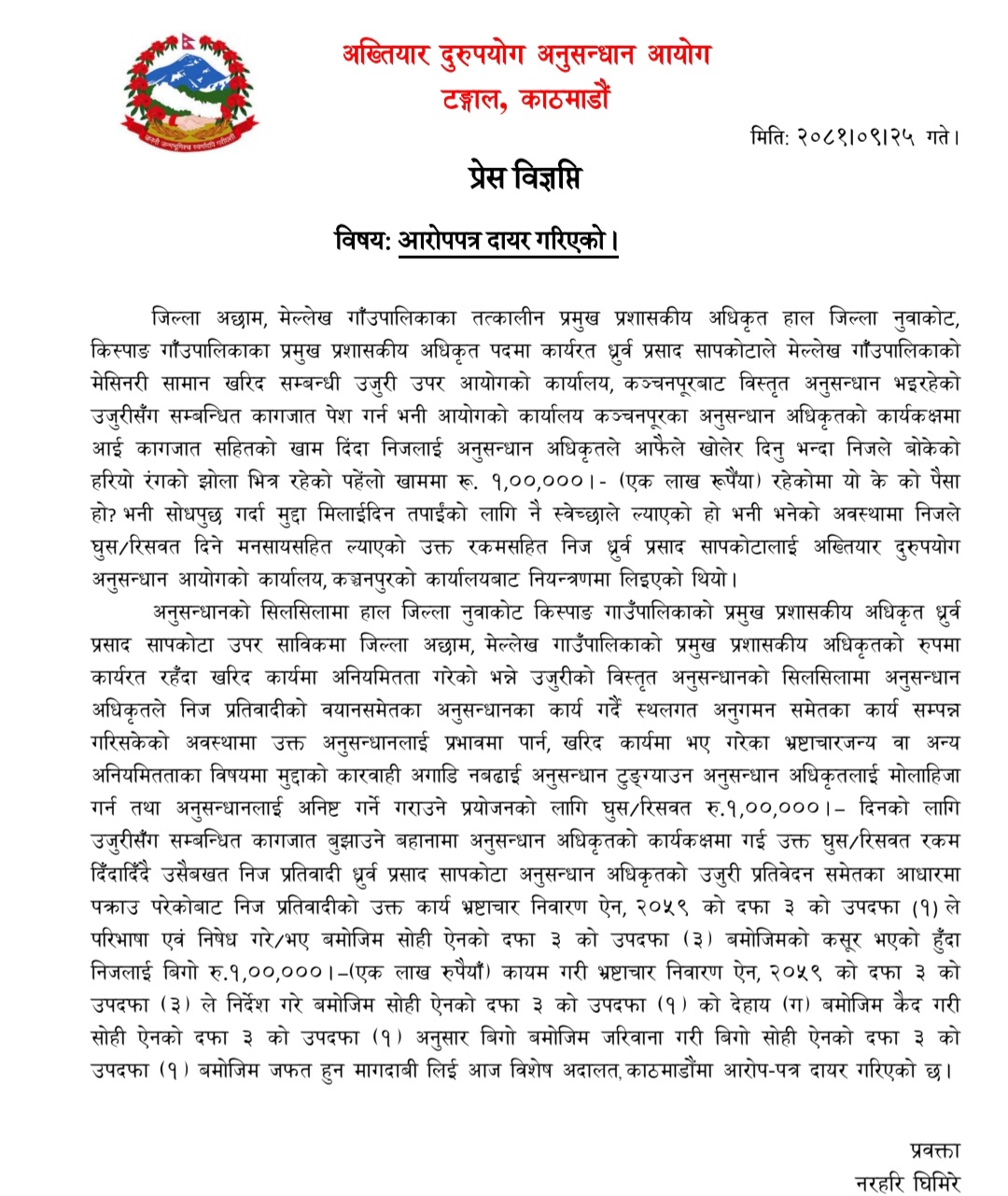 आयोगले बिहीबार एक विज्ञप्ति जारी गरी अछामको मेल्लेख गाउँपालिकाका तत्कालीन प्रमुख प्रशासकीय अधिकृत ध्रुव प्रसाद सापकोटा उपर घुस/रिसवत दिई भ्रष्टाचार गरेको आरोपमा मुद्दा दायर गरेको जनाएको हो ।