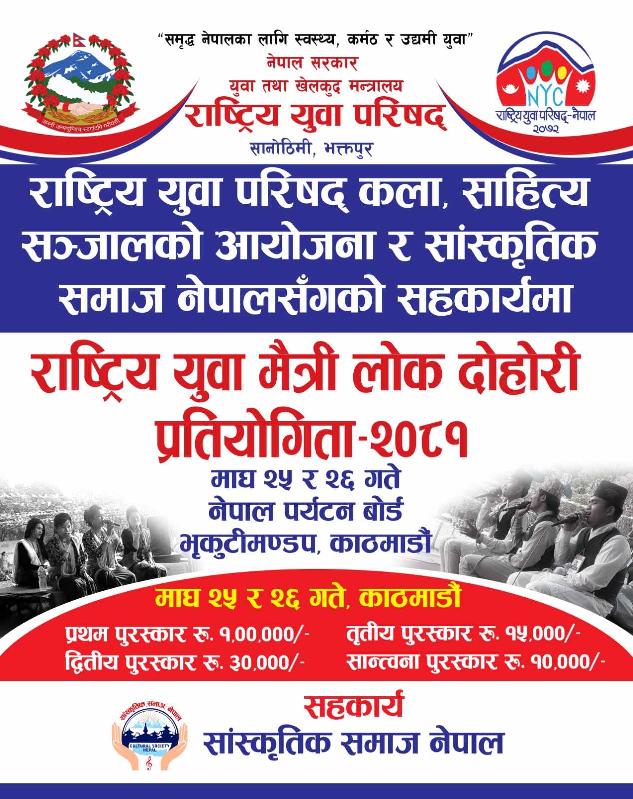 २४ माघ ,काठमाडौ । राष्ट्रिय युवा परिषद् कला साहित्य सञ्जालको आयोजना तथा सास्कृतिक समाज नेपालको सहकार्यमा राष्ट्रिय युवा मैत्री लोक दोहोरी प्रतियोगिता काठमाडौमा शुक्रवार देखि हुने भएकोछ।