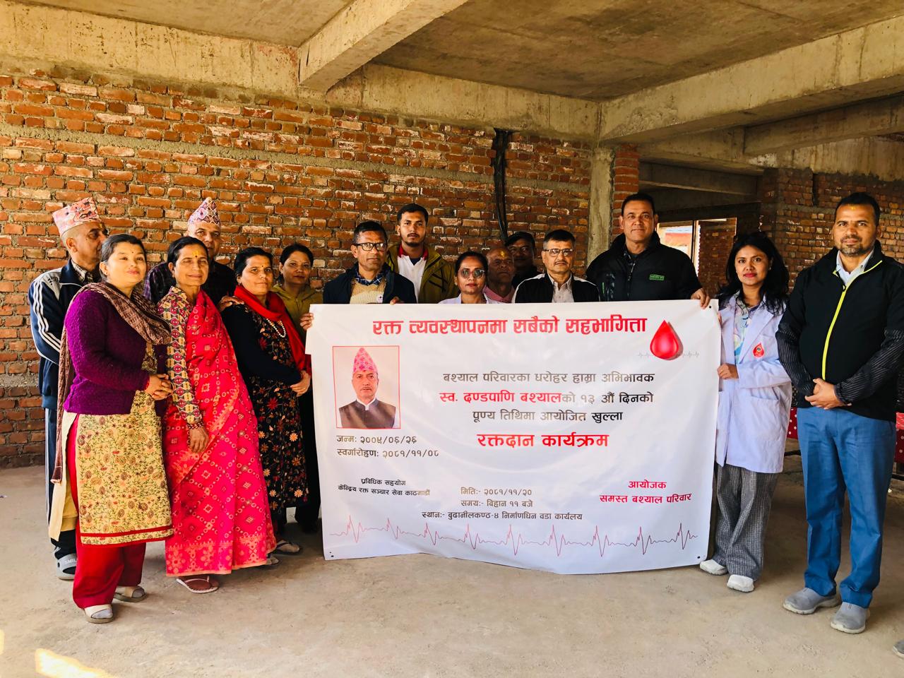 स्व. दण्डपानी बस्यालको १३ औं पुण्य तिथि पारेर रक्तदान कार्यक्रम आयोजना गरिएको बस्याल परिवारले जानाकारी दिए। कार्यक्रममा वडा न ४ का वडा अध्यक्ष श्री राम के सि प्रमुख अतिथी रहेका थिए ।