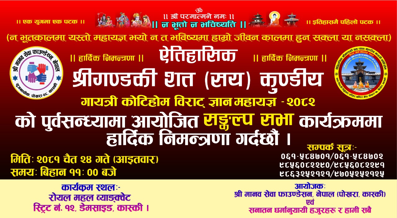 महायज्ञको सफल आयोजना सुनिश्चित गर्न संकल्प सभा यही आईतबार (चैत २४ गते) बिहान १० बजे पोखरा–१७ डोमसाइडस्थित स्ट्रिट नं. १२ मा रहेको रोयल महल ब्याङ्क्वेटमा आयोजना गरिने भएको छ।