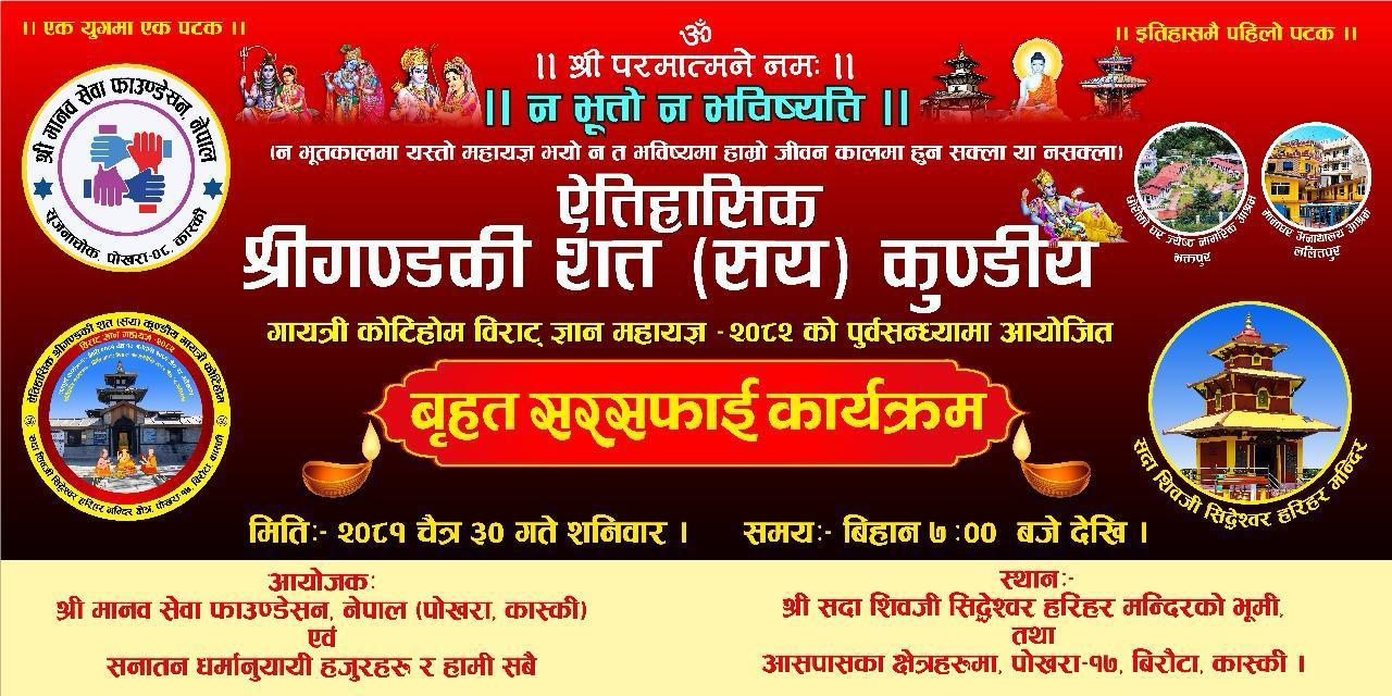 पोखरा, कास्की । ऐतिहासिक तथा धार्मिक कार्यक्रम ‘श्रीगण्डकी शत कुण्डीय गायत्री कोटिहोम विराट ज्ञान महायज्ञ–२०८१’ को पूर्वसन्ध्यामा बृहत सरसफाइ कार्यक्रम सञ्चालन गरिने भएको छ। मानव सेवा फाउन्डेसनको आयोजनामा आउँदो शनिबार, चैत्र ३० गते बिहान ७ बजेदेखि पोखरा–१५ स्थित सदाशिवजी सिद्धेश्वर हरिहर मन्दिर क्षेत्र र श्रीगण्डकी कोटिहोम यज्ञस्थल वरपर सफाइ अभियान चलाइनेछ।