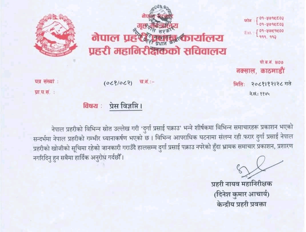 बिहीबार साँझ प्रहरी प्रधान कार्यालय, नक्सालले एक विज्ञप्ति जारी गर्दै केही सञ्चारमाध्यममा “दुर्गा प्रसाईं पक्राउ परेका छन्” भन्ने आशयका समाचार सम्प्रेषण गरिएकोमा त्यसप्रति ध्यानाकर्षण भएको जनाउँदै, यस्ता समाचार भ्रमपूर्ण रहेको उल्लेख गरेको छ।
