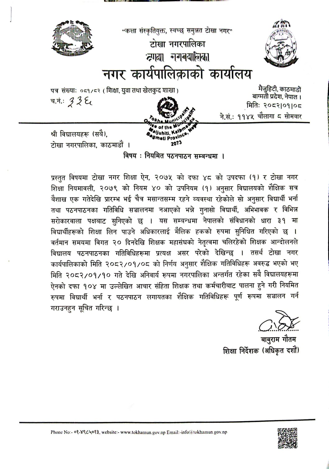 टोखा ,काठमाडौ ९ बैशाख -टोखा नगरपालिकाले वैशाख १० गतेदेखि नगर क्षेत्रभित्रका सम्पूर्ण विद्यालयहरू अनिवार्य रूपमा सञ्चालन गर्नुपर्ने स्पष्ट निर्देशन दिएको छ। सोमबार सम्पन्न कार्यपालिका बैठकपछि एक विज्ञप्ति जारी गर्दै नगरपालिकाले यस्तो निर्णय सार्वजनिक गरेको हो।