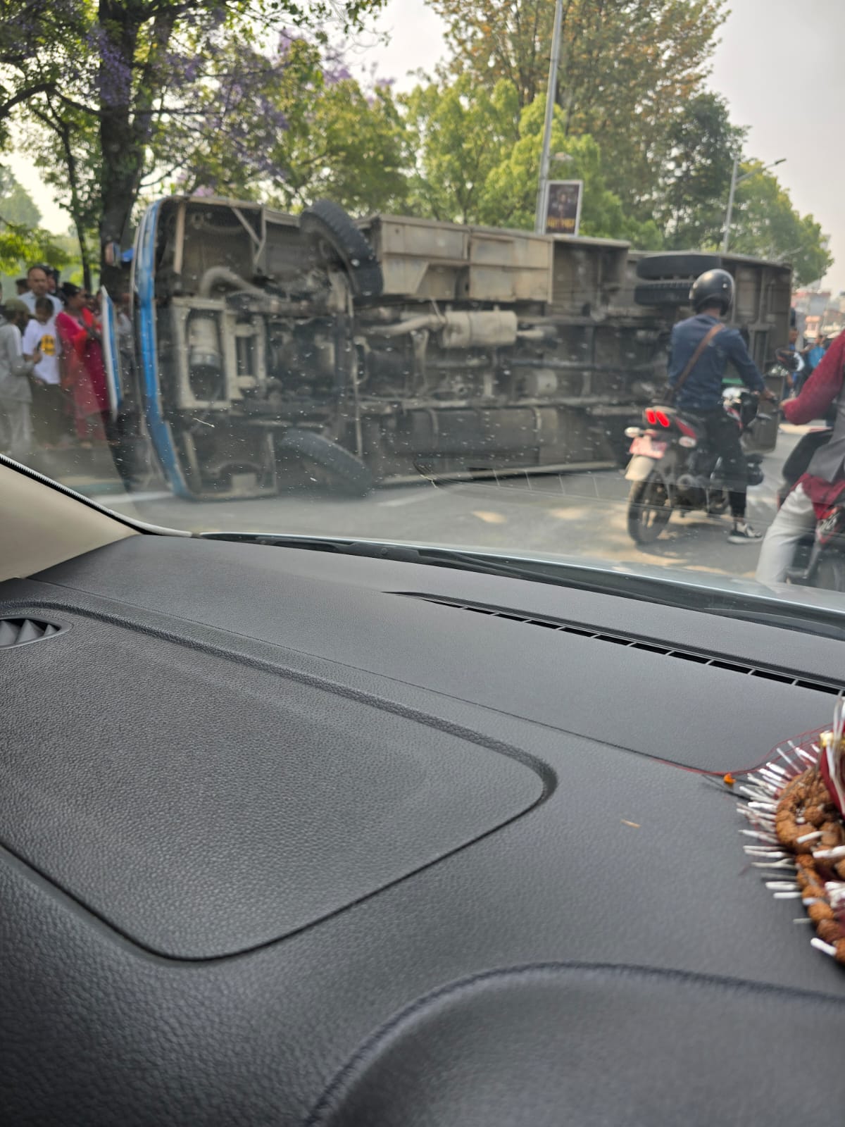 काठमाडौं, वैशाख २४– एअरपोर्ट सूचना विभागअगाडि गौशालाबाट कोटेश्वरतर्फ जाँदै गरेको एक यात्रुबाहक बस आज बिहान अनियन्त्रित भई सडकमा पल्टिएको छ। घटनामा मानवीय क्षति नभएको पुष्टि भएको छ।