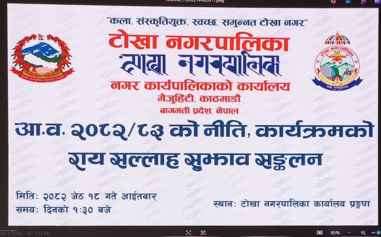 टोखा १९ जेठ । टोखा नगरपालिकाले आर्थिक वर्ष २०८२/८३ का लागि प्रस्तावित नीति तथा कार्यक्रममाथि राय, सल्लाह तथा सुझाव संकलन गर्न आइतबार आयोजना गरेको सार्वजनिक छलफल कार्यक्रम जनताको सक्रिय सहभागितासहित सम्पन्न भएको छ।