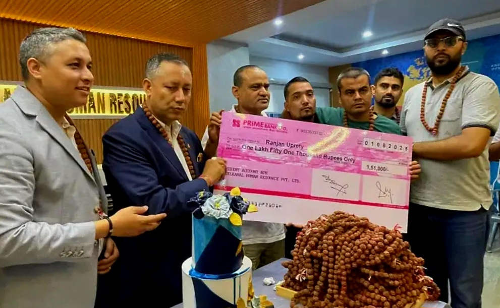 काठमाडौं, साउन १६– सिनामंगलस्थित निलकमल ह्युमन रिसोर्स प्रा.लिले आफ्नो १७औं वार्षिकोत्सव भव्य रूपमा मनाउँदै वैदेशिक रोजगारका क्रममा कुवेतमा एउटा खुट्टा गुमाएका झापा, सुरुङ्गाका २९ वर्षीय अन्जन उप्रेतीलाई दुई लाख रुपैयाँ आर्थिक सहयोग सहित सम्मान गरेको छ।